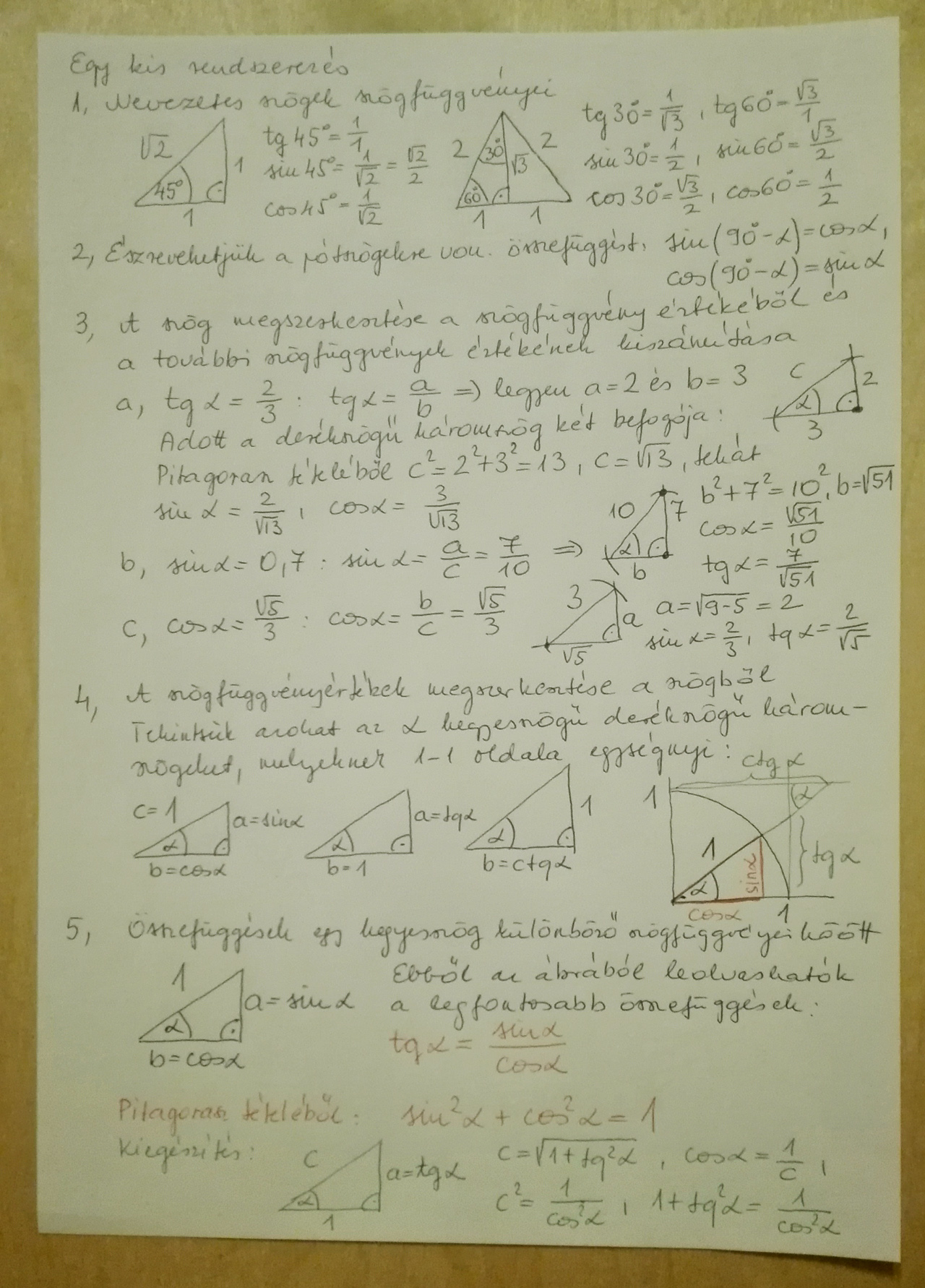 Összefüggések a hegyesszögek szögfüggvényei között